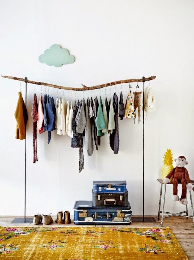 La rama-perchero es otro clásico, pero entelada y ubicada en la esquina de una cama infantil, sirve