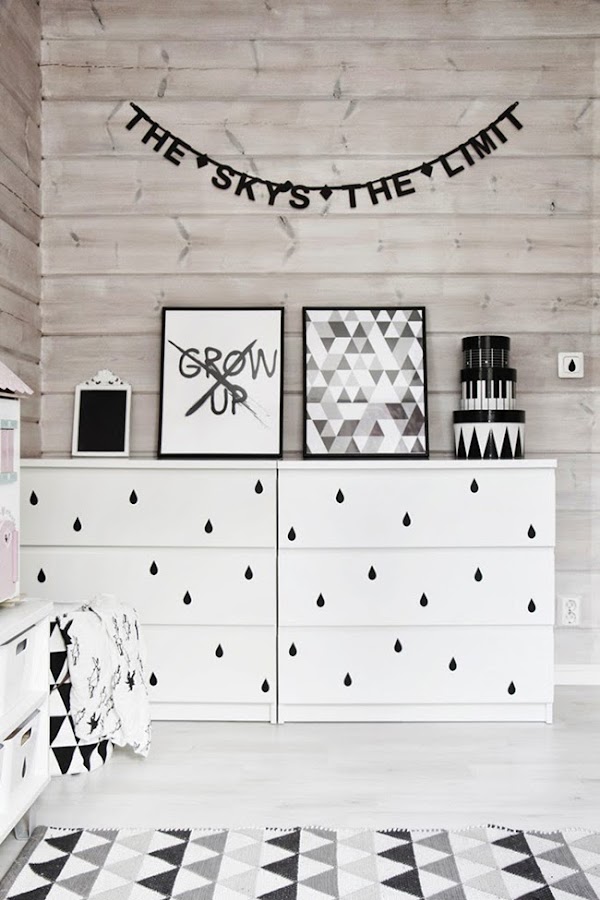 Hoy os traigo una idea que me encontré el otro día para darle un toque personal a la cómoda de 6 cajones, se trata de decorarla con pegatinas de vinilo en forma de gota de lluvia, la idea a además de original es muy actual y sin duda le dará un toque divertido a vuestra cómoda por muy poco dinero.