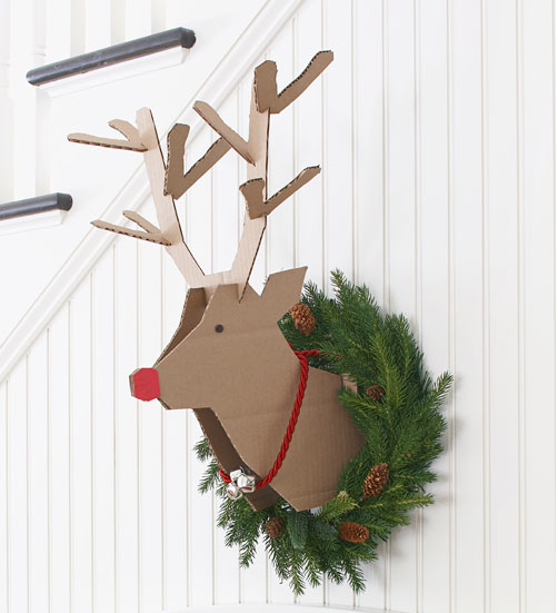 La segunda idea decorativa, es la cabeza del reno en cartón. Tambien muy fácil y totalmente low-cost ¿porqué quién no tiene una caja de cartón rodando por la casa?.