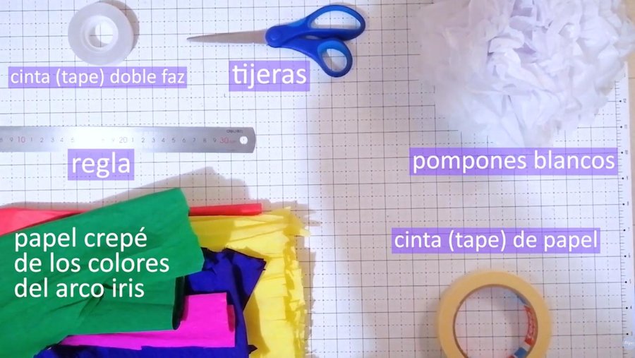 Y solo necesitarás cita doble cara , tijeras, pompones blancos, papel creppe y cinta de carrocero (de papel)