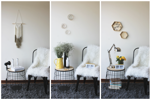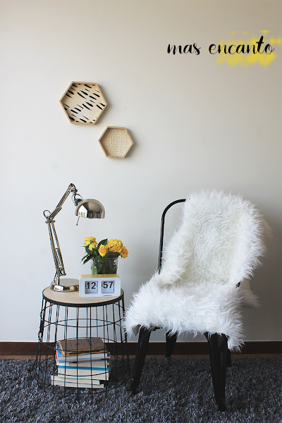 Vamos a ver 3 ideas para "redondear" el conjunto. Como veis, los complementos son los que tienen la última palabra y, aunque ya sabéis que lo mío es amor del bueno con el blanco y negro y que me cuesta arriesgar dándole colorín a la casa, he incorporado alguna pincelada de amarillo, que creo que le aporta vida al conjunto, siguiendo con la idea de que quede un rincón "neutro".