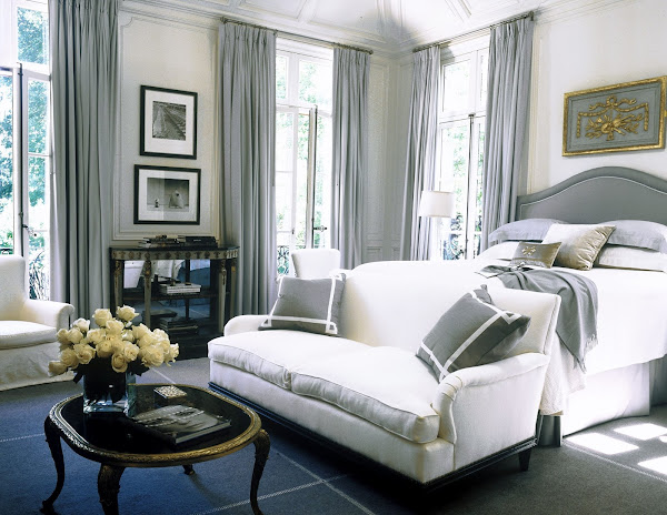 Agregue otras telas de sensaciones sensuales a través del dormitorio con un suave mohair o un tiro de cachemira en el brazo de una silla de lectura, cubra las paredes con tapicerías de seda o texturadas, cuelgue cortinas de seda o un toldo de cama de seda, o agregue lujosos revestimientos para pisos.