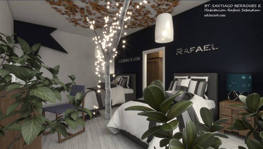 ¡Con lo que nos gusta la naturaleza! Tener un árbol que crezca en casa nos parece un sueño... ;) ¡O un árbol perenne que brille todas las noches! jajaja! Sea como fuere, nos parece un recurso decorativo sorprendente para separar espacios como en este dormitorio compartido, y para darle carácter.