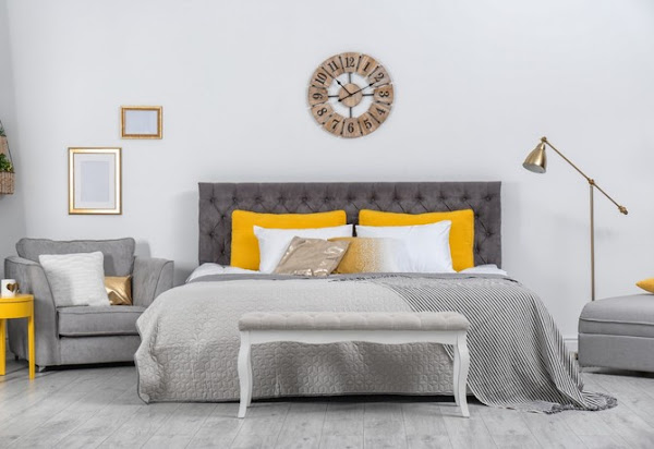 6. Dormitorio gris y amarillo