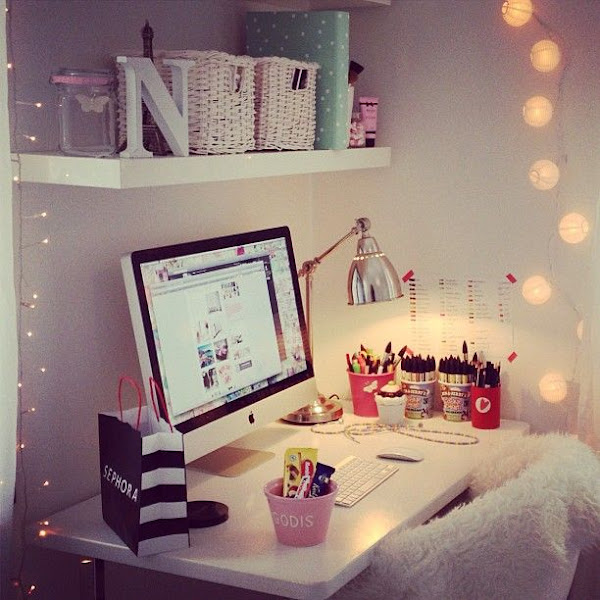 Perfect workspaceLa verdad es que los móviles y las tabletas están haciendo que muchos de nosotros echemos más tiempo navegando en el sofá o en la cama que en el ordenador de nuestro escritorio, pero seguro que a muchos de ustedes les pasa como a mi, y es que yo necesito sentarme en el escritorio para poder hacer algo provechoso. Si tengo que navegar o leer o cualquier otro tipo de actividad en el ordenador, móvil o iPad, lo hago en cualquier sitio, pero para escribir en Cositas Decorativas o estudiar, me tengo que sentar en mi escritorio y como no, éste tiene que estar super chulo y tiene que ser un sitio que me identifique, que me haga sentir a gusto. Pon recuerdos, dale vida con fotos y mensajes positivos, pon una ilustración de tu grupo preferido e ilumínalo como se merece. Ya tienes un "workspace" perfecto. Estos que os enseño seguro que os inspiran.