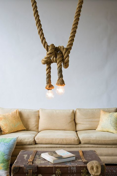Sé original iluminandoEsta es quizás la idea más difícil de tomar de las 5 que os estamos enseñando hoy, pero tienen que ser conscientes de que cuando entran en una casa y tiene una lámpara tan original como la que os enseño, cualquier invitado quedará prendado contigo y tu manera de decorar tu casa. A mi me gustan personalmente todo lo que sean un "batiburrillo" de objetos, ya sean botellas de cristal, un montón de pantallas cada una con una tela diferente o simples bombillas colgantes. No sé. Sigo con mi recomendación estrella: no tengas límites. De la que os enseño, la que más me gusta es la soga de la que salen las dos bombillas. Ese tipo de lámpara me parece perfecta para ponerla encima de una mesa de comedor de una vivienda de costa. ¿Cuál os gusta a ustedes?