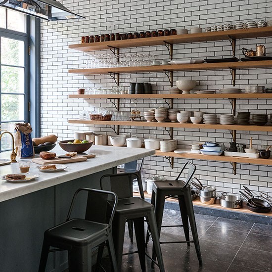 Muebles de almacenaje en colores de madera desgastada .Utilizar madera reciclada como los palets es ideal para crear unos muebles de aspecto rústico y low cost.También pueden ser de obra. Las baldas son otro elemento para almacenar ,teniendo los utensilios a la vista(La cocinas de antes poseían pocos muebles).