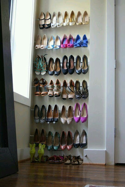 8- Barras de acero para colgar todos los zapatos con tacón, es una forma sencilla y económica. Los puedes poner en una pared o detrás de una puerta, aunque tiene una pega y es que la pared se acaba manchando.