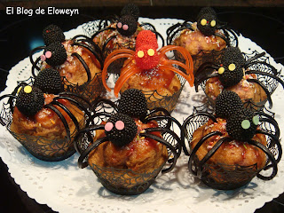 Y claro no pueden faltar en la mesa unas buenas arañas , jejejjeej.... suerte que sabemos que son para comer por que si no .... Son unas magdalenas de lo mas originales y divertidas , además de fáciles de hacer , tal como siempre os digo clicad este enlace para ver como se hacen www.eloweyn.blogspot.com.es