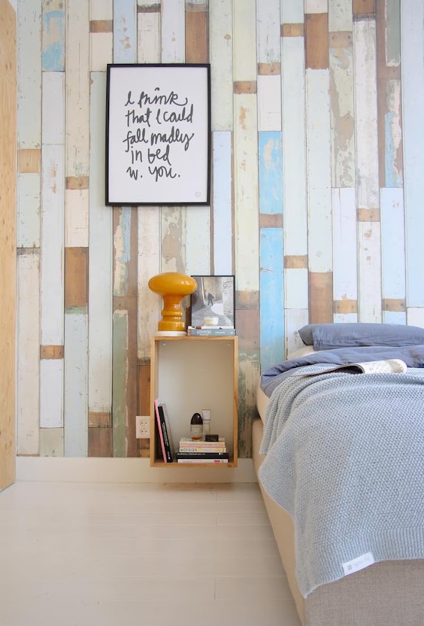 En situaciones muy "minis", queda fenomenal forrar la pared con madera, poner papel pintado, levantar un muro a media altura que haga de repisa y pueda incorporar alguna luz. A grandes males, mejores soluciones. Esta cabecero de azulejos, por ejemplo, no puede ser más espectacular y a penas come centímetros.
