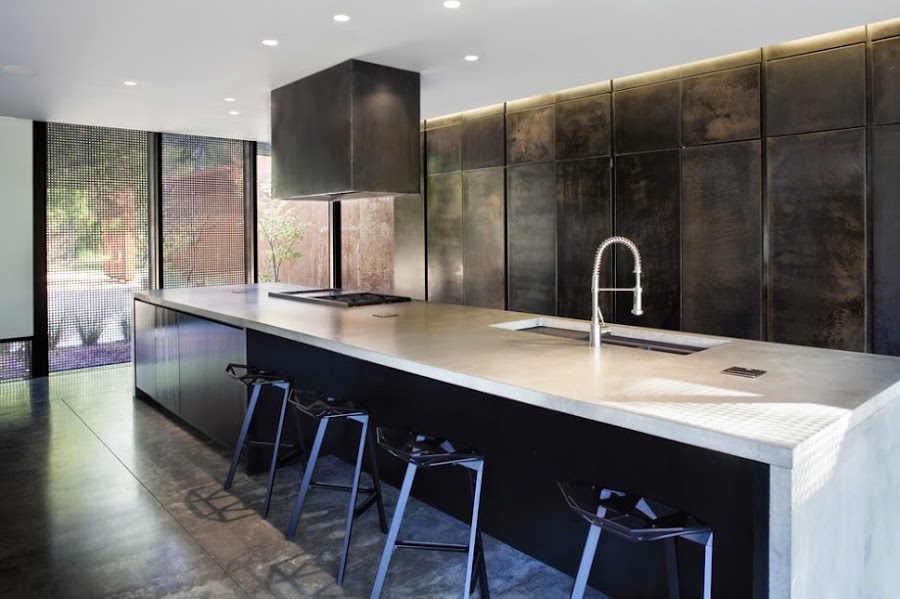 En la imagen de abajo, los muebles de cocina están galvanizados, acero laminado en caliente con una clara capa de acabado - el acero se acoda sobre una base de MDF. El aspecto final es nada menos que espectacular!