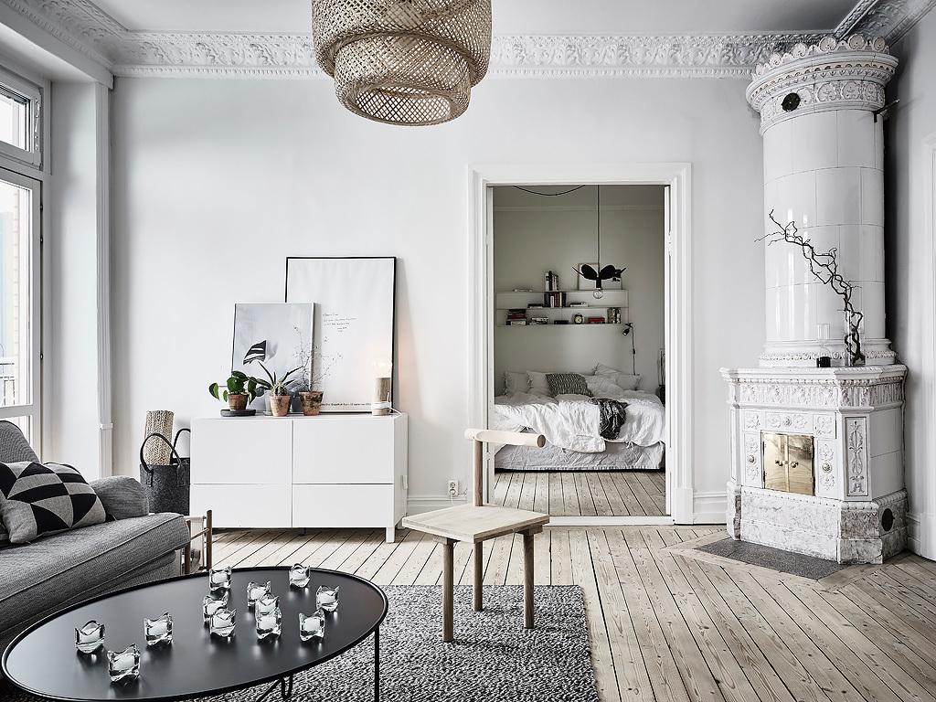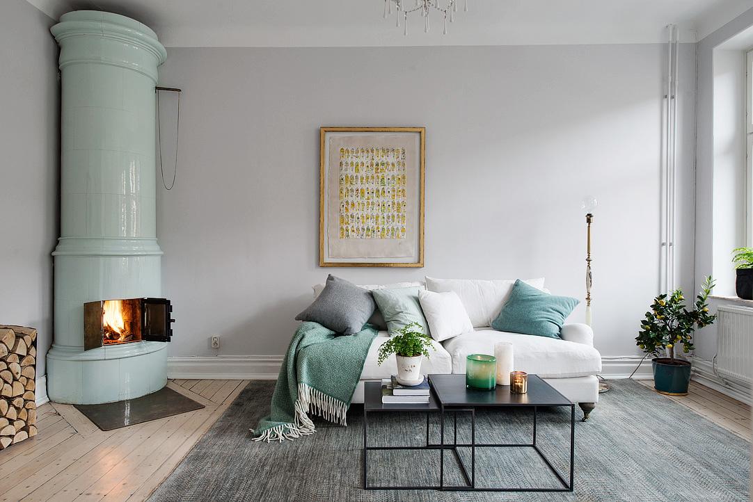 6. Que no falte calor de hogar. ¿Te has percatado de las enormes estufas de hierro fundido que podemos encontrar en la esquina de la mayoría de los espacios de estilo nórdico? ¿Son preciosas verdad? Normalmente cilíndricas y con un gran volumen que va de suelo a techo, no pasan desapercibidas y son un elemento decorativo más a tener en cuenta como en este espacio, donde se ha coordinado con el color de los cojines.