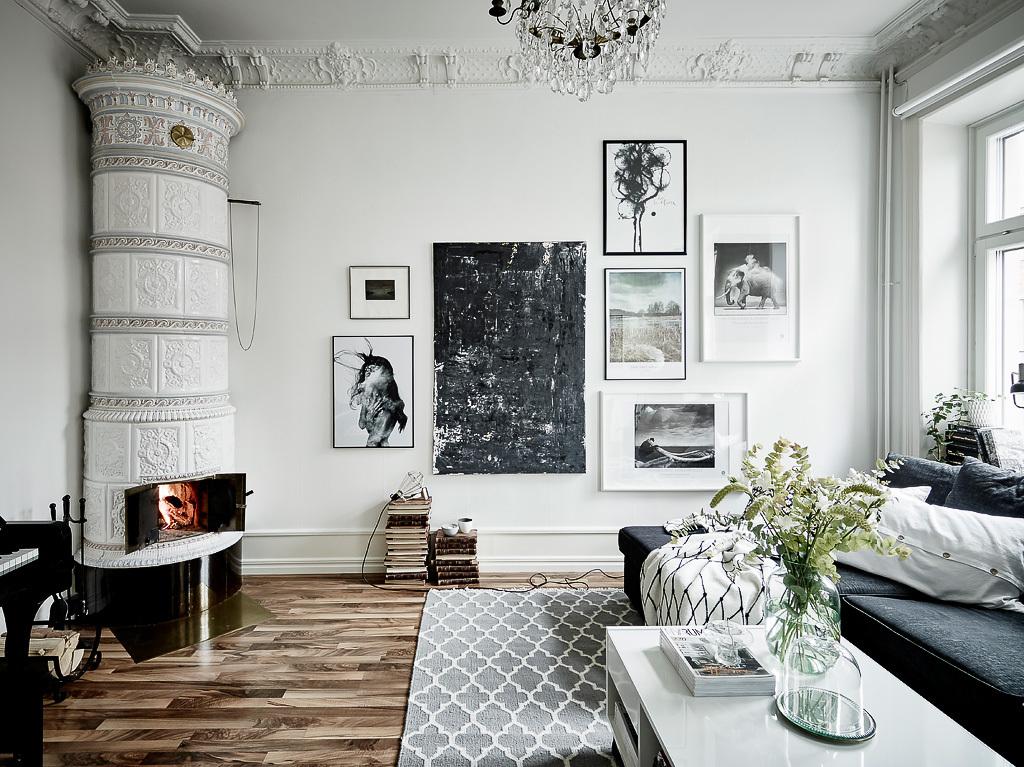 7. Gusto por el arte. Si hay un estilo que sabe sacar partido a una pared vacía, ese es el estilo nórdico. Son especialistas en crear composiciones únicas y memorables mezclando elementos tan variopintos como obras de arte, fotografías, láminas, arte gráfico, letras, letreros, etc. Todo ello organizado en elegantes y sobrios conjuntos llenos de dinamismo donde el blanco y el negro es el color protagonista.