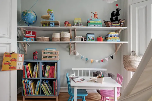 Porque será la única manera de aprovechar al 100% el espacio del que disponéis. En el cuarto de los peques, deja algún mueble bajo con libros a su alcance y sube esas cosas que usan menos a estantes volados, así tendrán sitio abajo para jugar, pintar lo que sea que les apetezca.Fotografía cortesía ALVHEM