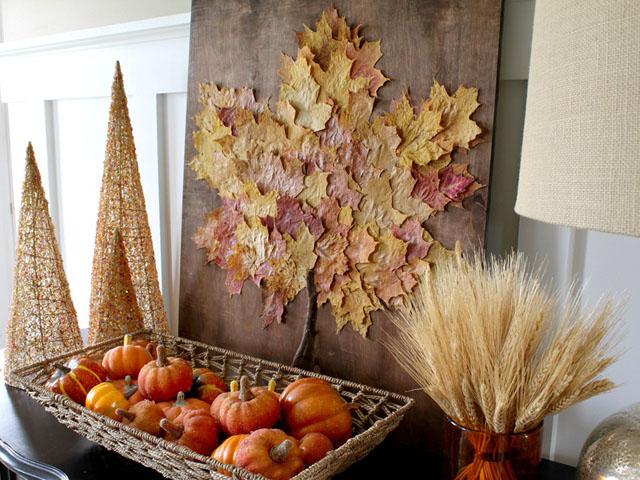 Un cuadro que utiliza como soporte la madera para hacer una gran hoja y crear un rincón muy otoñal a modo de bodegón.