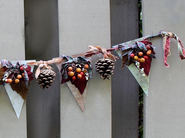 Otra guirnalda hecha con restos de tela y frutos otoñales.