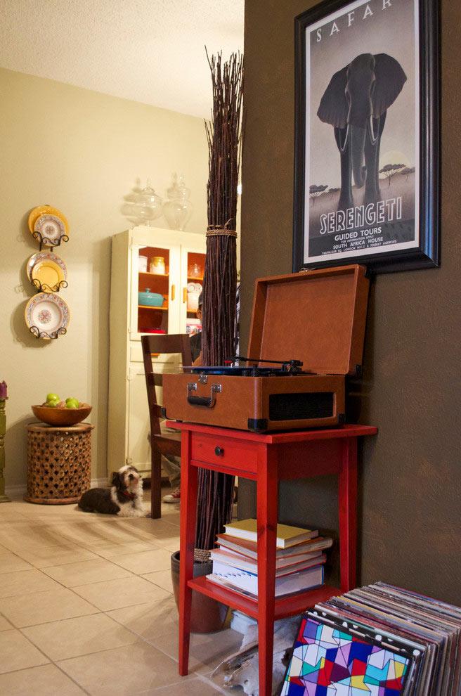 En cualquier otro rincón del salón como esta propuesta para almacenar y poner algún objeto especial como aquí es un tocadiscos vintage,Puede ser una radio antigua..... un teléfono o cualquier otro objeto que quieras destacar por su valor por ejemplo sentimental.