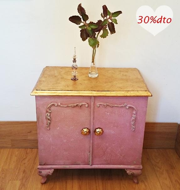 Si quieres crear tu propio rincón personal e intransferible ,original y auténticamente único en la shop tenemos mesitas de noche super chulas con descuentos especiales como esta Mesita rosa y dorada.