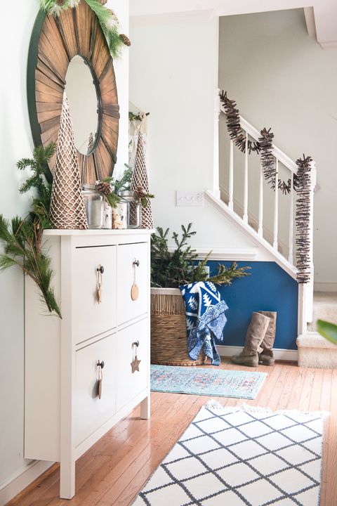 Pínta letras en los cubos galvaniados para formar una palabra y siembra pinos dentro, o bien, coloca algunas ramas de árboles navideños naturales o artificiales. Decora con una cinta roja a cuadros y luces y ponlos en los peldaños.