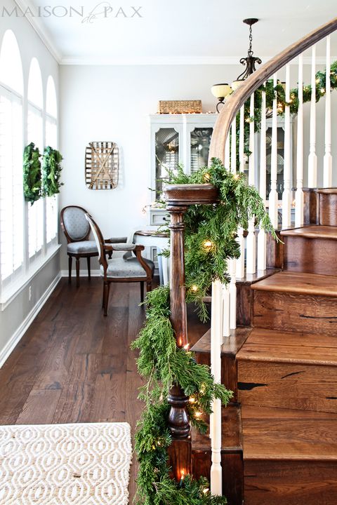 Si tu hogar está repleto de madera y colores amarronados, decora el pasamanos con una guirnalda de madera.