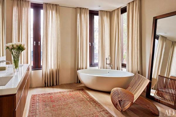 en este baño me ha sorprendido la incorporación de esta enorme alfombra persa...