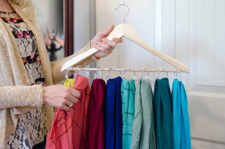 Utiliza anillo de la cortina del baño o bien cualquier anillo de al menos 7 cm de diámetro. Abre cada anillo y coloca una de las bufandas en el.