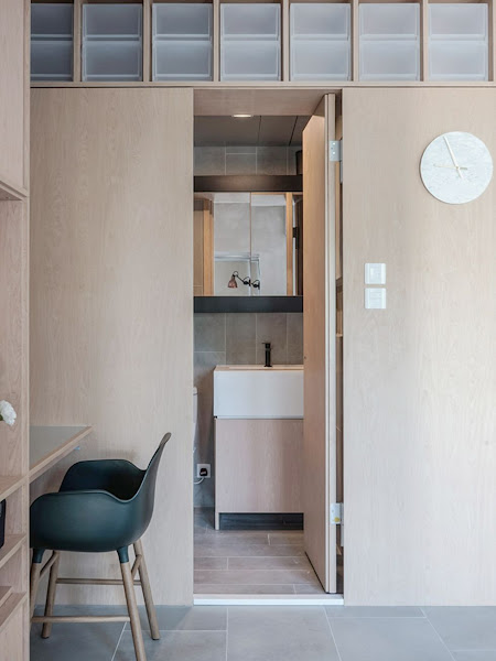 La entrada de este cuarto de baño se encuentra oculta en un frente de armarios. Es una de las ideas para no recargar el ambiente de un apartamento de 32 metros cuadrados.