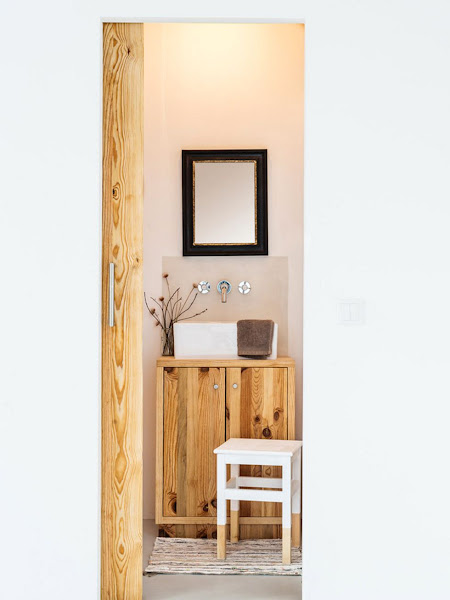 Poner una puerta corredera siempre ayuda, proporcionará casi un metro cuadrado más a tu cuarto de baño. Es lo que hicieron en una antigua vivienda de pescadores de 40 metros cuadrados de Ibiza que rehabilitó el estudio Due Architecture & Design.