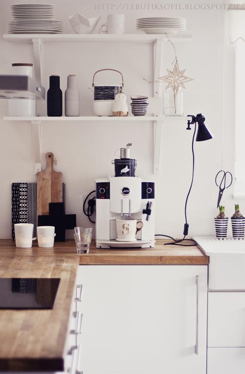 Si eres un apasionado de la cocina seguro que cualquier rincón es susceptible de ser aprovechado. En este caso se han usado unas escuadras de madera blancas para poner unos estantes de mármol, a juego con la encimera.