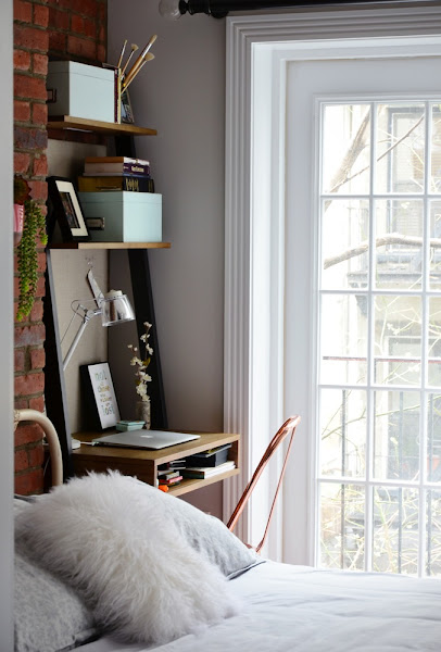 - Lo mejor: el dormitorio-estudio con la cama de hierro color bronce con las macetas como cabecera sobre un fondo de ladrillo y la estantería como escritorio es espectacular.