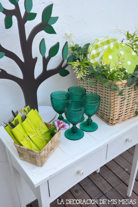 Cuando hacemos una fiesta de pié, montar una mesa de buffet es un gran acierto. Además de presentar la comida de una forma cuidada y bonita, es imprescindible presentar la vajilla (platos, vasos, cubiertos etc...) de una manera original y dandole cierto protagonismo.