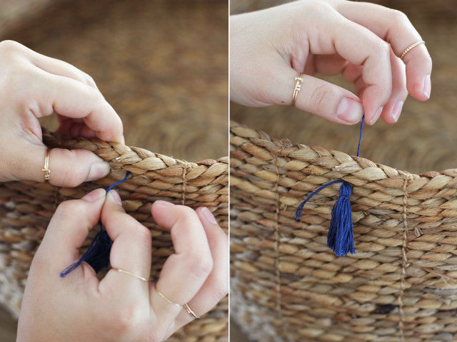 Decorar con borlas definitivamente se ha puesto de moda. Esta vez os contaré cómo se hace en el caso de cestos de mimbre o cestas de todo tipo, pero también circulan por ahí muchas ideas para hacerlo con zapatos, mantas, cubrecamas, cazadoras, bolsos... En fin, ¡Borlas y pompones por doquier!