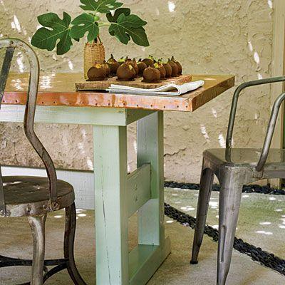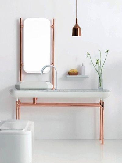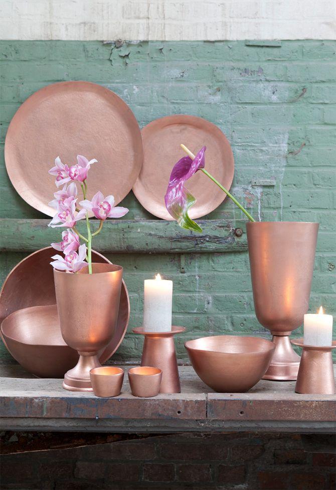 Los detalles en tonos cobre pueden incorporarse en decoración desde detalles textiles como cojines,papeles pintados,lámparas,maceteros, mesas, tuberías de este material que sirven como base para crear muebles, pequeñas piezas formando bodegones junto a otros materiales.Las opciones son de lo más variadad.