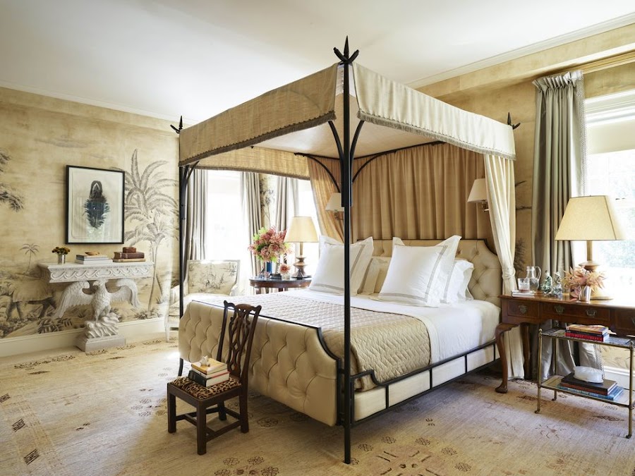El diseñador Miles Redd demuestra que las habitaciones monocromáticas pueden ser fascinantes al mezclar materiales lujosos como este revestimiento de pared personalizado de tinta sobre papel con antigüedades de pedigrí. En esta habitación de Nueva Jersey, una seda cruda Roger Arlington y un cuero Edelman cubren la cama con dosel de Morgik Metal Designs .Zafiro y Perlas