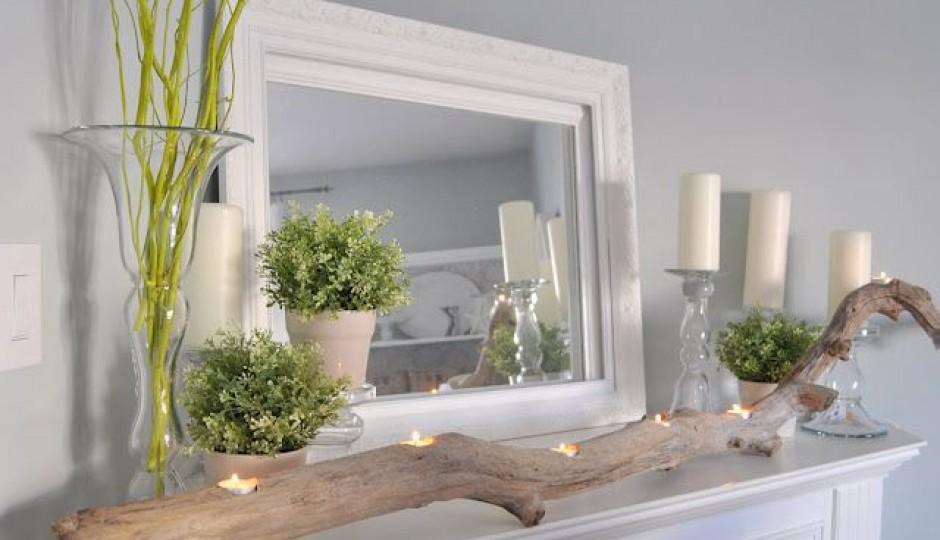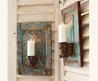 Madera como troncos,ramas y elementos reutilizados como trozos de antiguas ventanas, puertas ,molduras, viejas patas de muebles a modo de candelabro o cualquier otro material de derribo.