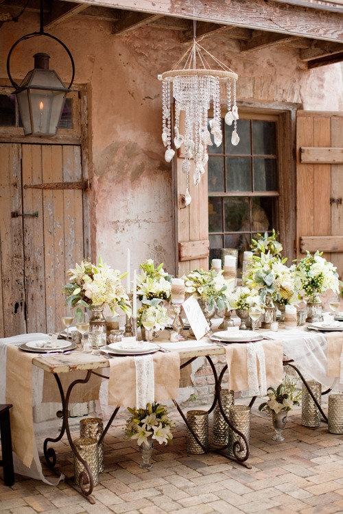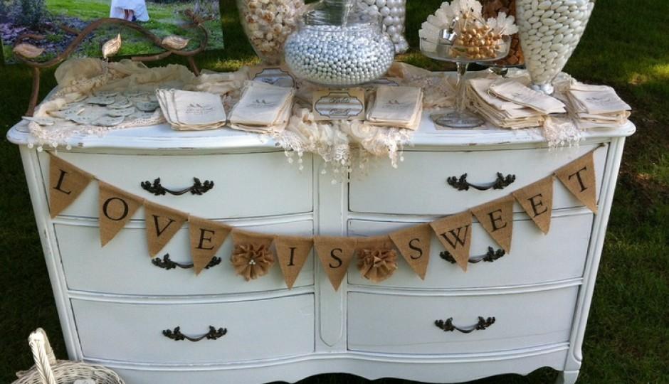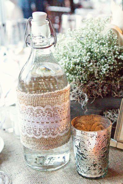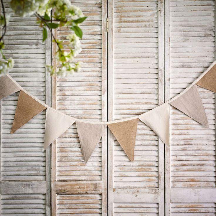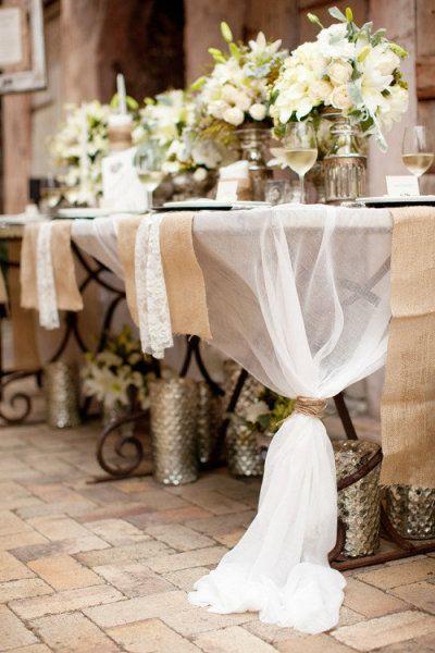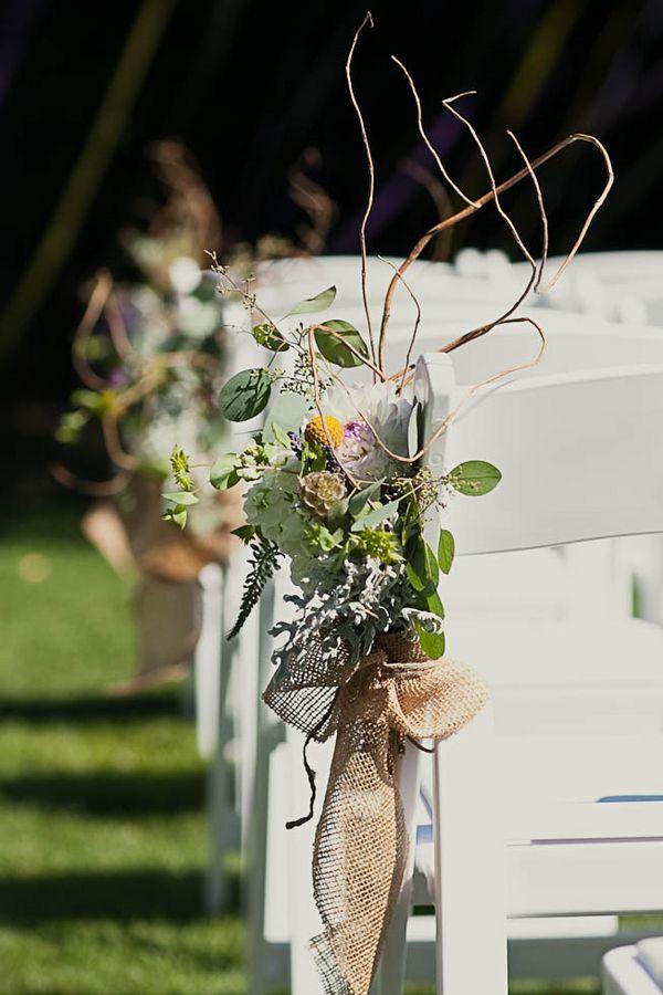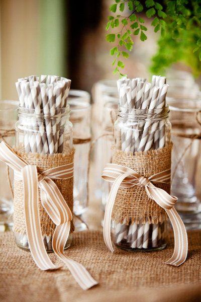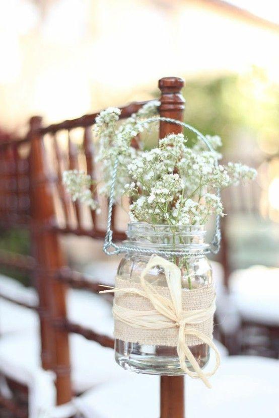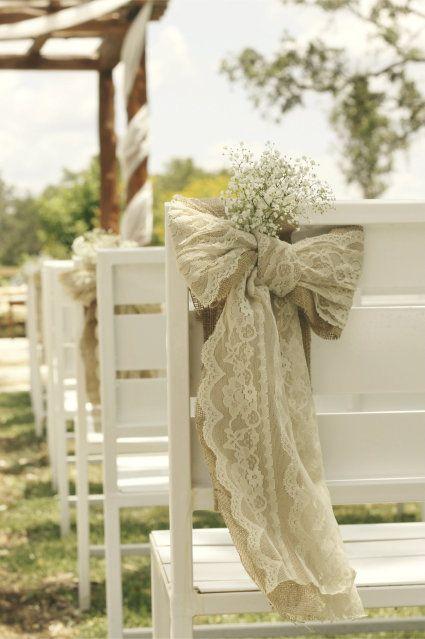 Y mil y una versiones de arpillera, reinventado su uso una y otra vez.Lo podemos ver envolviendo tarros, portavelas, a modo de banderines y pompones y como no ,ya un clásico, decorando las sillas de los invitados y novios.