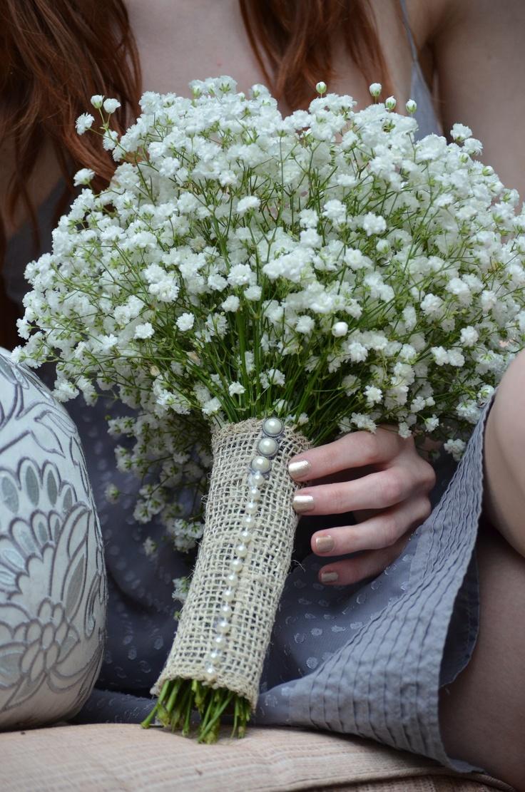 Detalles para los novios como este ramo de paniculata envuelto en rafia y rematado de perlas. La sencillez hecha belleza.