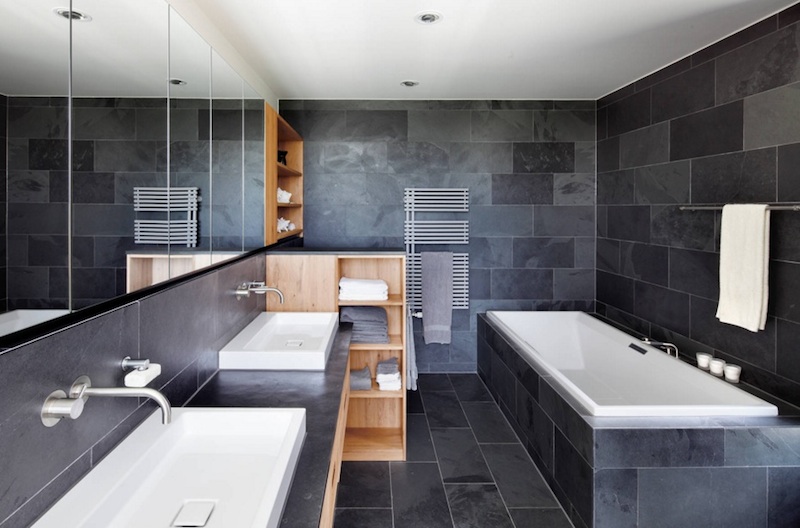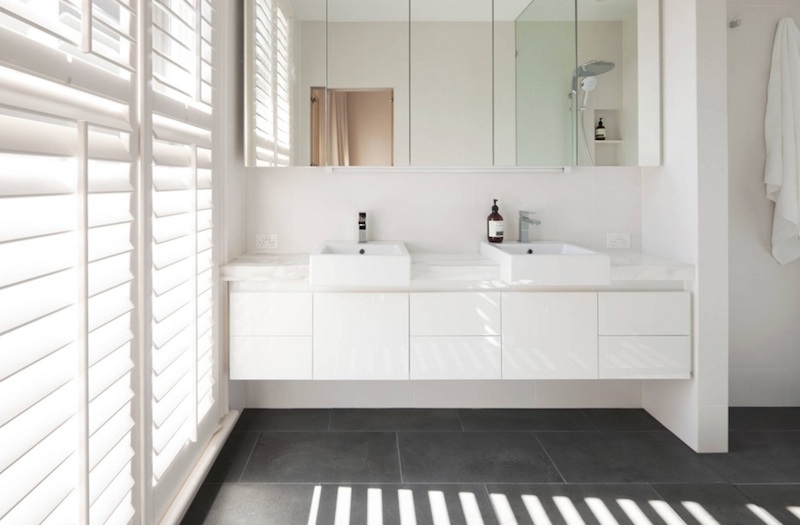 Una de las maneras más fáciles para crear un aspecto moderno en su cuarto de baño es en gran medida por apostar a un esquema de color monocromático. Este combo clásico se ve elegante y sofisticada, y nunca pasa de moda.