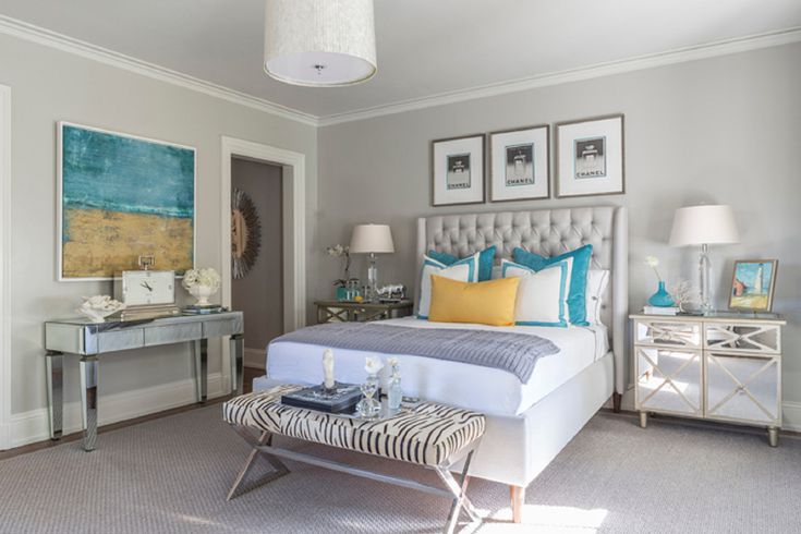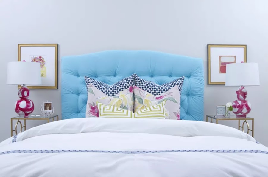 Su lámpara de cabecera es una de las maneras más fáciles de agregar un toque de color, textura, patrón o contraste a su dormitorio. Aquí, Kelly Rogers Interiors eligió una lámpara de perro color turquesa para cubrir una mesita de noche de color amarillo brillante. El contraste le da mucha vida a la habitación.