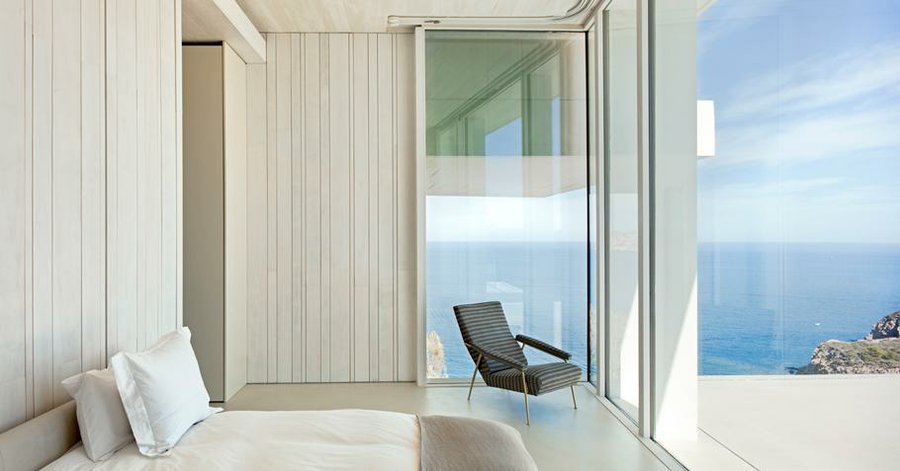 Está claro que la arquitectura de esta vivienda es impresionante y habla por sí misma. Esas paredes de doble altura flanqueadas por ventanales, superpuestos en dos hileras y prolongándose hasta el techo, y el movimiento de la estructura interior... ¡dejan sin palabras! Ahora bien, el microcemento ayuda a fomentar la sensación de paredes infinitas, ya que no incorpora juntas ni cortes que rompan la armonía del conjunto. La decoración pasa a un segundo plano para evitar restar protagonismo a ese escenario de inigualable belleza.