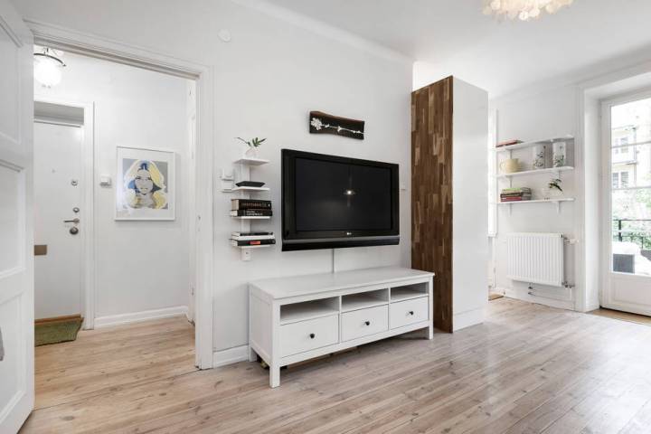 Este apartamento tiene lo básico, pero muy bien organizado. La distribución es diáfana pero a la vez los espacios están bien definidos y no se solapan.