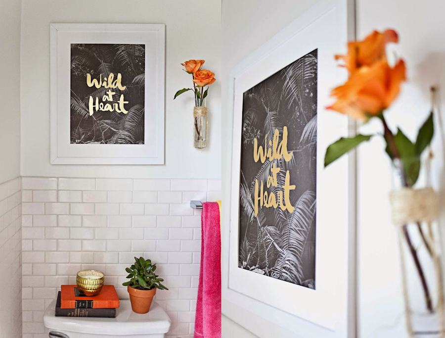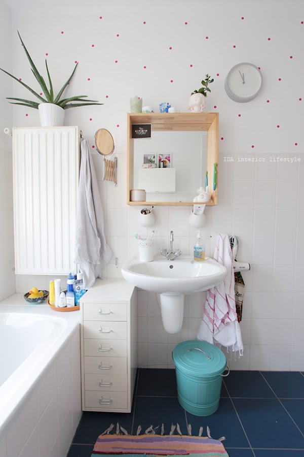 Un espejo actual y atractivo añade el toque cálido con la madera natural, al igual que las cestas en fibra natural. La luz y el color vienen de la mano de los textiles, tanto de la alfombra como la toallas. También nos podemos atrever a colocar unos lunares en la pared con washitape. Y por supuesto no nos podemos olvidar de incluir alguna planta que aportará frescor al baño. Como ves una mínima inversión para un resultado sorprendente.