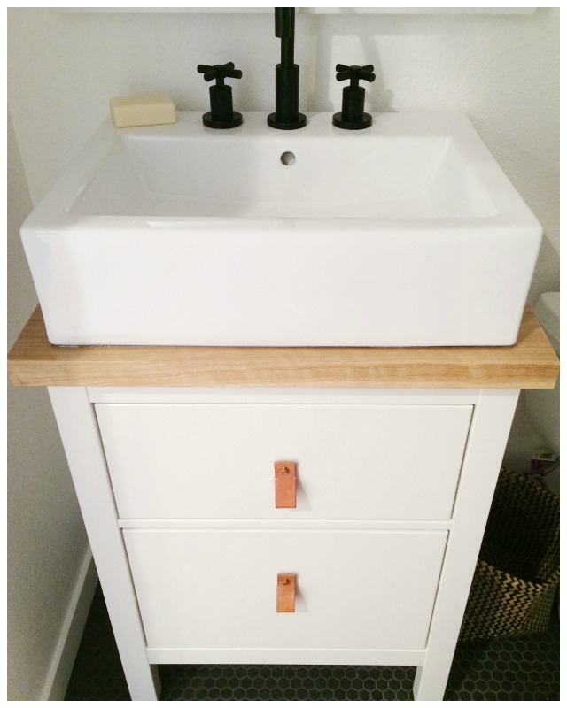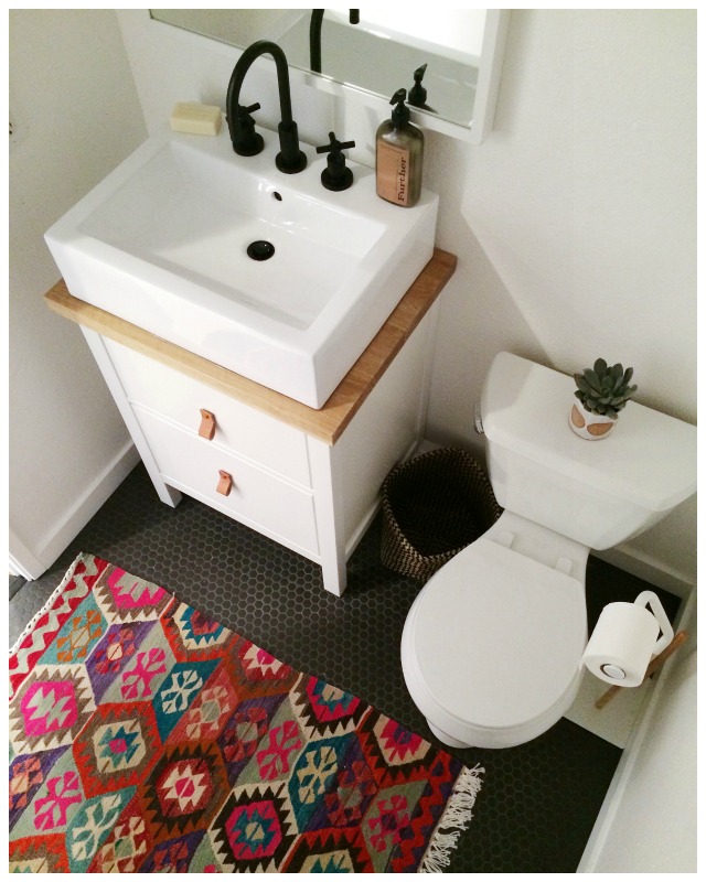 El aseo que vemos a continuación demuestra que reformar un baño no tiene que suponer una gran obra. En este caso concreto se solucionó con una mano de pintura blanca en las paredes y un suelo vinílico en color gris pizarra para crear mayor luminosidad gracias al contraste. Eso si el lavabo se sustituyo y en su lugar se instaló un mueble con unos preciosos tiradores de cuero. También la encimera es de madera clara y sobre se apoya un gran lavabo cuadrado. El resto de encanto lo ponen los detalles; como la alfombra, las cestas, los complementos decorativos, y la original grifería en color negro. Desde luego es innegable que es posible pasar de un aseo anticuado y triste a uno envidiable sin necesidad de obra.