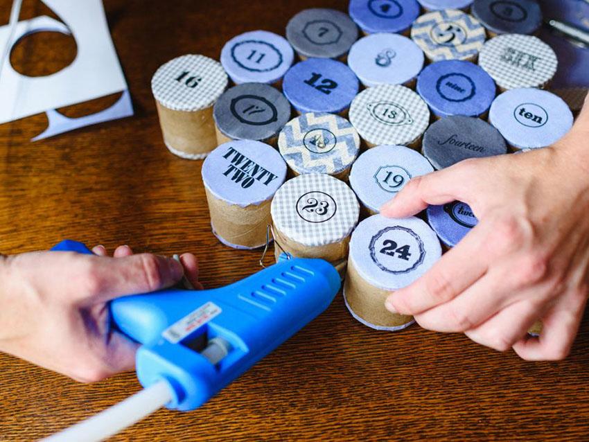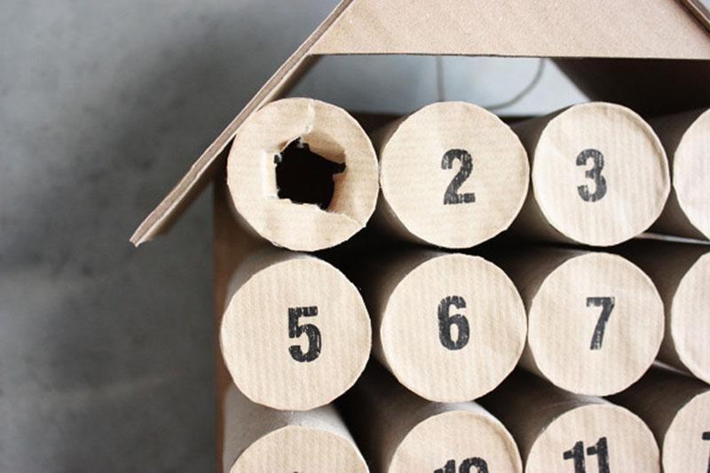 Fuente: HGTV Esta idea es similar a la de la casita, porque también te ayudará a reciclar los cartones de los rollos de papel. Busca también, papel de regalo (en tonos similares), un cúter, pistola de silicona, rotuladores o números adhesivos, y las sorpresas.