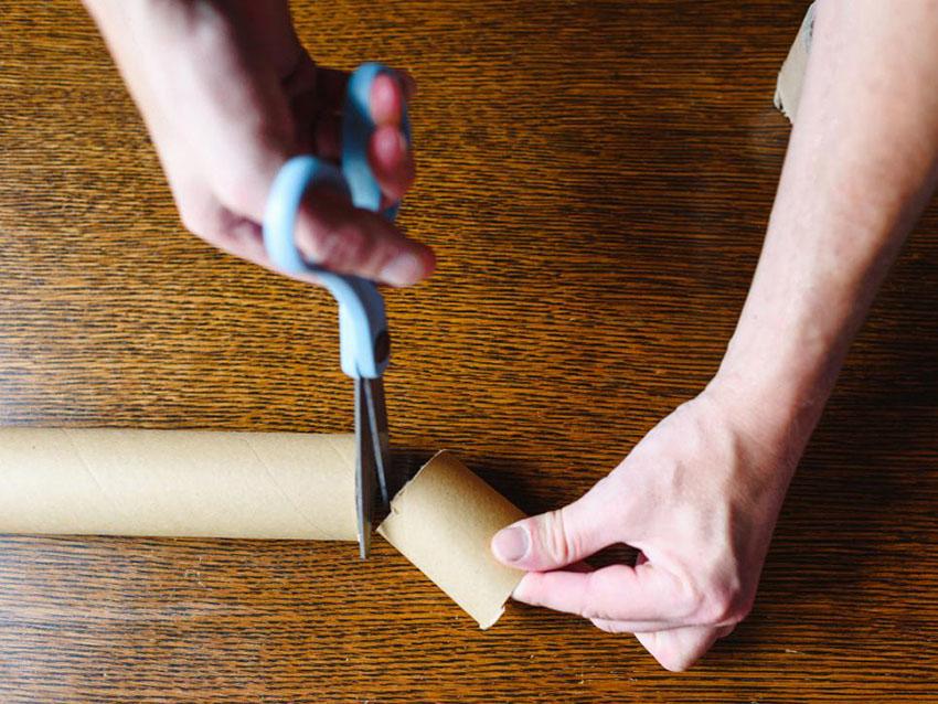 Fuente: HGTV Corta los 24 tubos de cartón a la misma medida. Después recorta dos círculos de papel de regalo, de un diámetro un poco mayor que el del tubo de cartón. Ahora cierra el tubo por la parte trasera. Repite esta operación 24 veces.