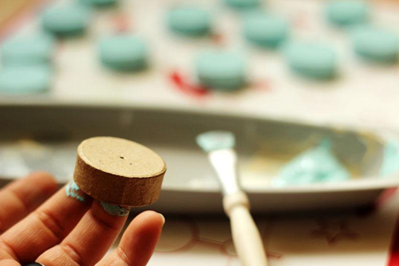 Fuente: Crafts UnleashedPinta las tapas con la pintura acrílica verde menta (o del color que tú prefieras) con el pincel. Deja secar.