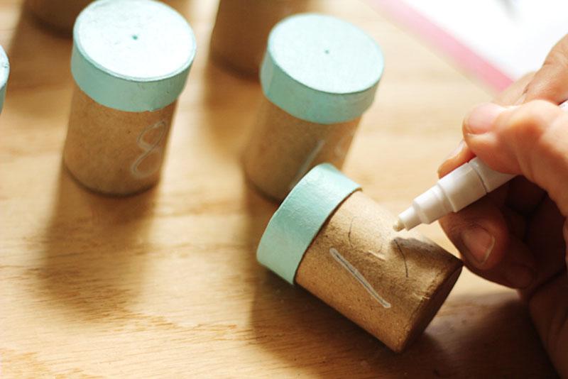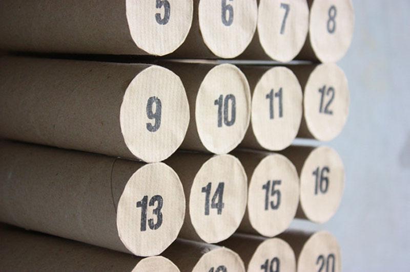 Fuente: Morning Creativity Escribe e imprime todos los números en papel kraft marrón. Después pégalos en uno de los extremos de los rollos de cartón y recorta el papel sobrante. Introduce las sorpresas en cada rollo y pega por la parte trasera una pieza de cartón que cierre los rollos y los mantenga unidos.