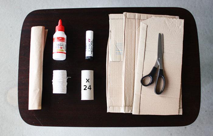 Fuente: Morning Creativity Estos son los materiales necesarios: 24 rollos de cartón de papel higiénico (también puedes cortar a la medida un rollo de papel de cocina), papel kraft, cartón, barra de pegamento, hilo, ordenador e impresora (para imprimir los números), aunque puedes dibujarlos tú mismo, estamparlos con sellos, etc.