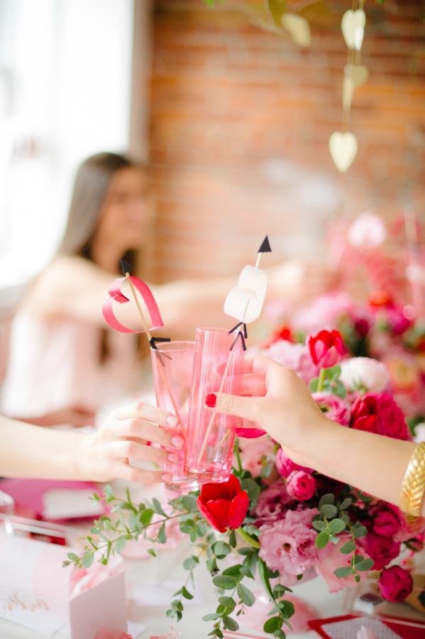 - Decoración para vasos. Con unos pinchos de madera crearemos unos palitos para decorar los vasos. También necesitamos cartulina roja o rosa y negra. Cortamos dos tiras de 1cm de grosor y las pegamos con forma de corazón. Para simular la flecha cortamos la cartulina negra con forma de triángulo pequeño y dos tiras muy pequeñas. Es muy sencillo de hacer, en la foto podéis ver como no tiene ninguna complicación.