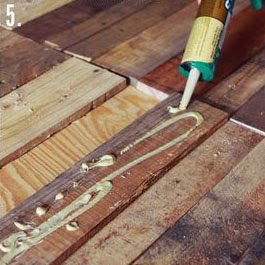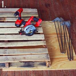 Materiales: tabla de madera para la base, 1 palet, caladora, lijadora, cola, patas metálicas, tornillos para las patas